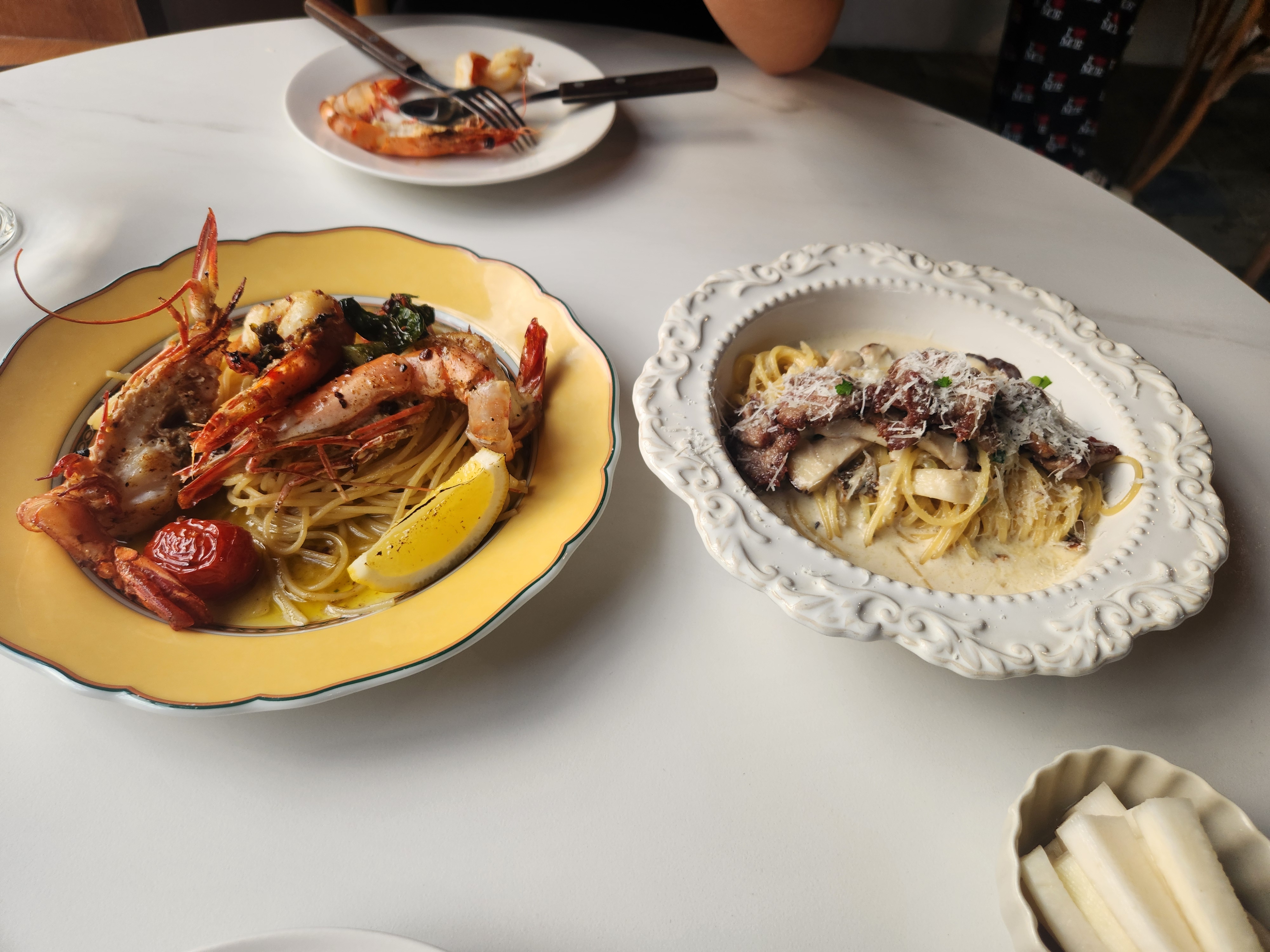 식당에서 뭐니뭐니 해도 가장 중요한 것은 아무래도 음식의 맛이겠죠? 저희가 시킨 메뉴는 만조와 왕새우 파스타였어요! 우선 만조는 제가 너무나도 좋아하는 꾸덕하면서도 부드럽고, 짭조름하면서도 크리미한 아주 맛있는 크림파스타였습니다. 그리고 위에 토핑으로 올라간 버섯과 소고기가 잘 어우러져서 흠잡을 곳 없는 맛이었어요.