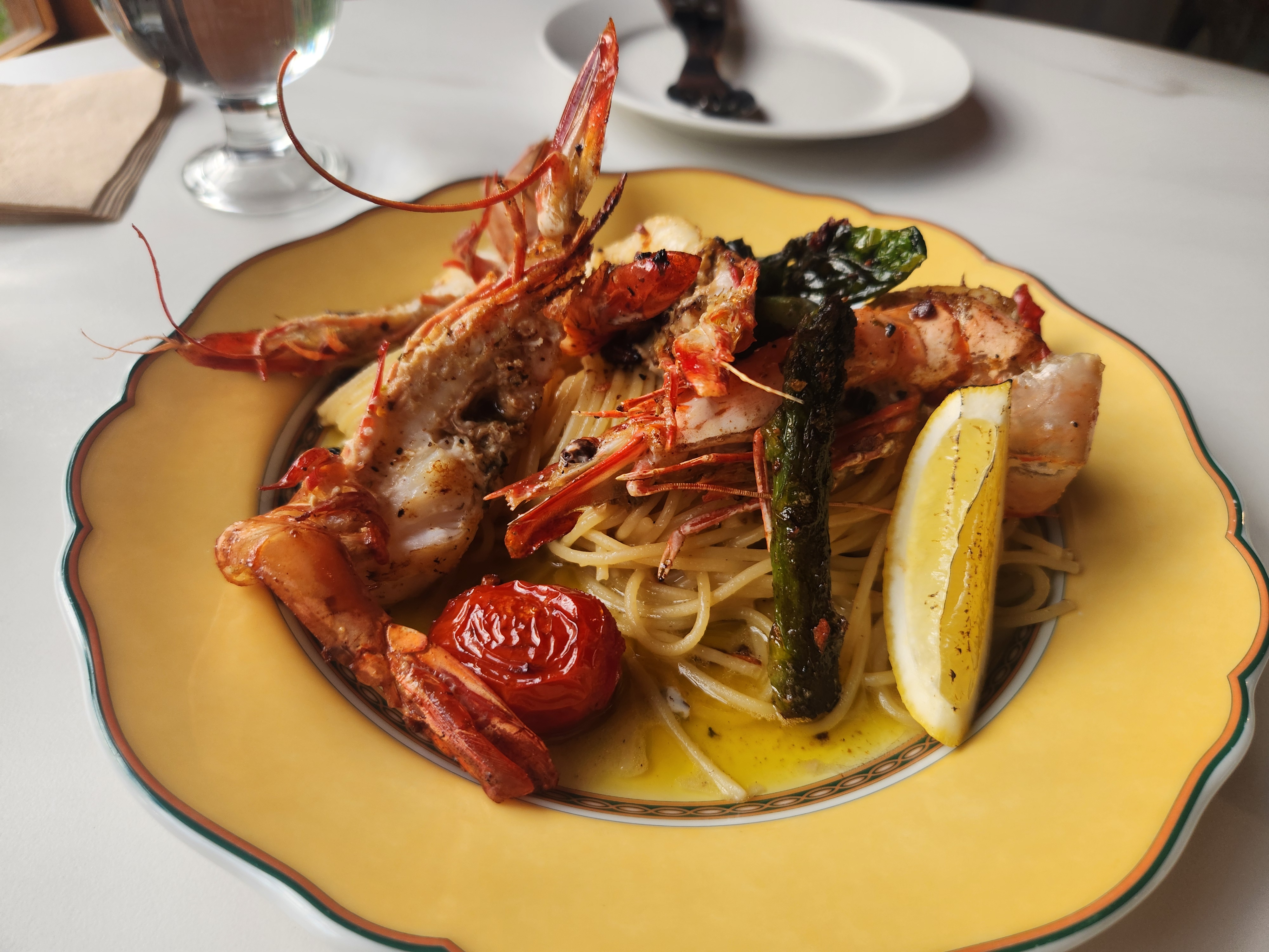 그리고 왕새우파스타는 바질과 마늘 베이스에 토마토와 레몬이 섞인 오일 파스타입니다. 맛있는 알리오올리오 파스타 느낌이었고 새우는 말할 것도 없이 매우 튼실했고, 크리미한 만조 파스타와의 조합도 너무나도 좋았습니다. 사진으로 보여드릴게요!