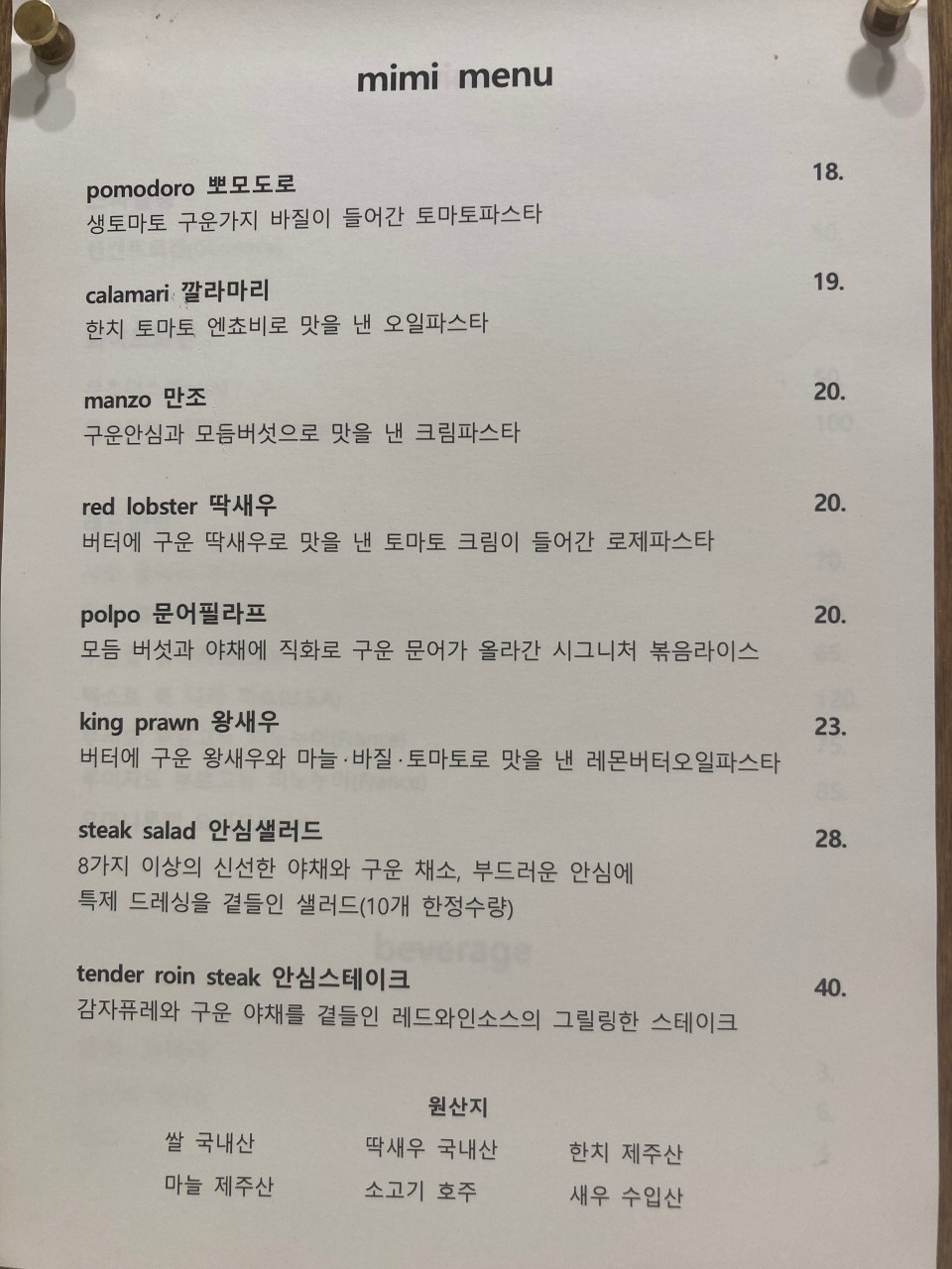메뉴는 파스타에 집중되어 있고 자세한 메뉴와 가격은 다음 이미지와 같습니다.
